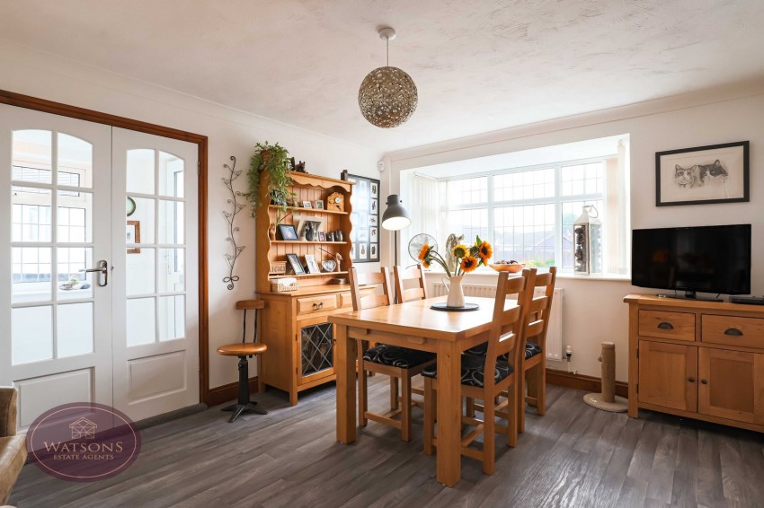 UPVC double glazed entrance door to the front, 2 uPVC double glazed windows to the side, 2 radiators, airing cupboard housing the combination boiler, ceiling spotlights. French doors to the dining area and stairs to the first floor leading to the primary bedroom and WC.