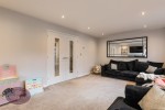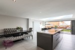 7.57m x 5.68m (24' 10" x 18' 8") A range of matching high gloss wall & base units with feature lighting, work surfaces incorporating an inset Belfast sink. Integrated double electric oven. Plumbing and wiring for an American style fridge freezer. Central island offering further storage space and housing the induction hob. Radiator, ceiling spotlights and tiled flooring with underfloor heating. Skylight and bi folding doors to the rear garden. Door to the utility room.