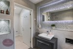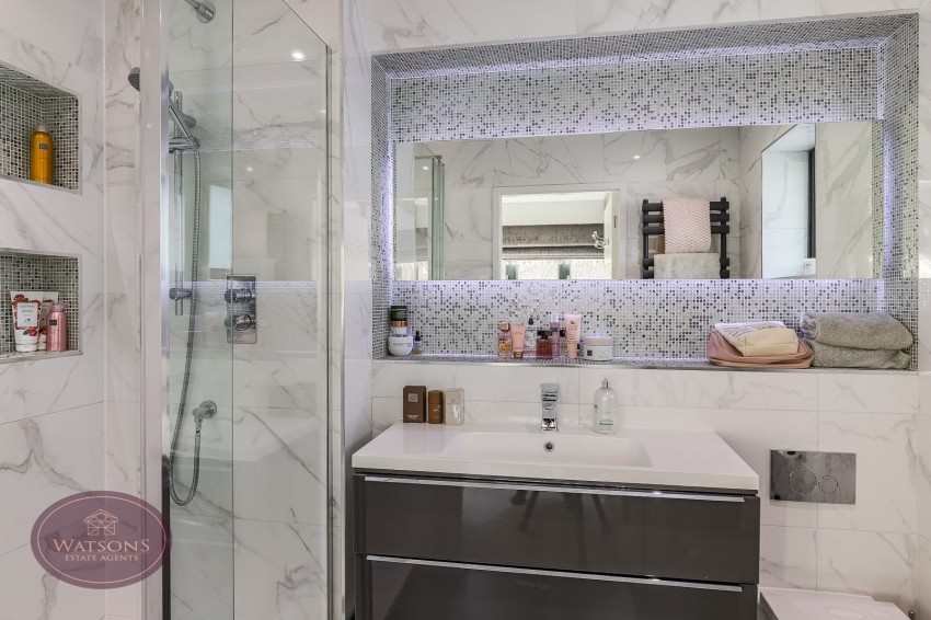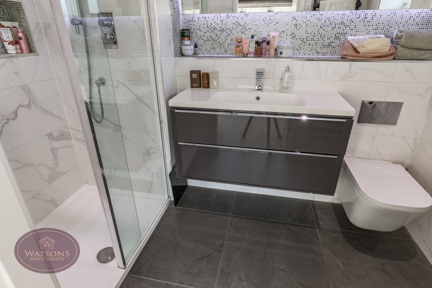 Obscured uPVC double glazed window to the side, WC, vanity sink unit with feature table top sink. Heated towel rail. Extractor fan, ceiling spotlights and tiled flooring. Double doors to the storage cupboard.
