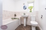 White 3 piece suite comprising wc, pedestal sink and panel bath. Obscured uPVC double glazed window to the rear, partially tiled walls and laminate wood flooring.