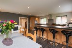 6.3m x 5.46m (20' 8" x 17' 11") A range of matching wall & base units, work surfaces incorporating an inset one & a half bowl sink & drainer unit. Integrated appliances to include: waist height electric double oven & grill and 5 ring gas hob with extractor over, fridge and dishwasher. Wine cooler, breakfast bar, tiled flooring, ceiling spotlights and 2 radiators. 4 uPVC double glazed windows to the rear, uPVC double glazed window to the side, French doors leading to the rear garden and sliding patio doors leading to the rear garden.